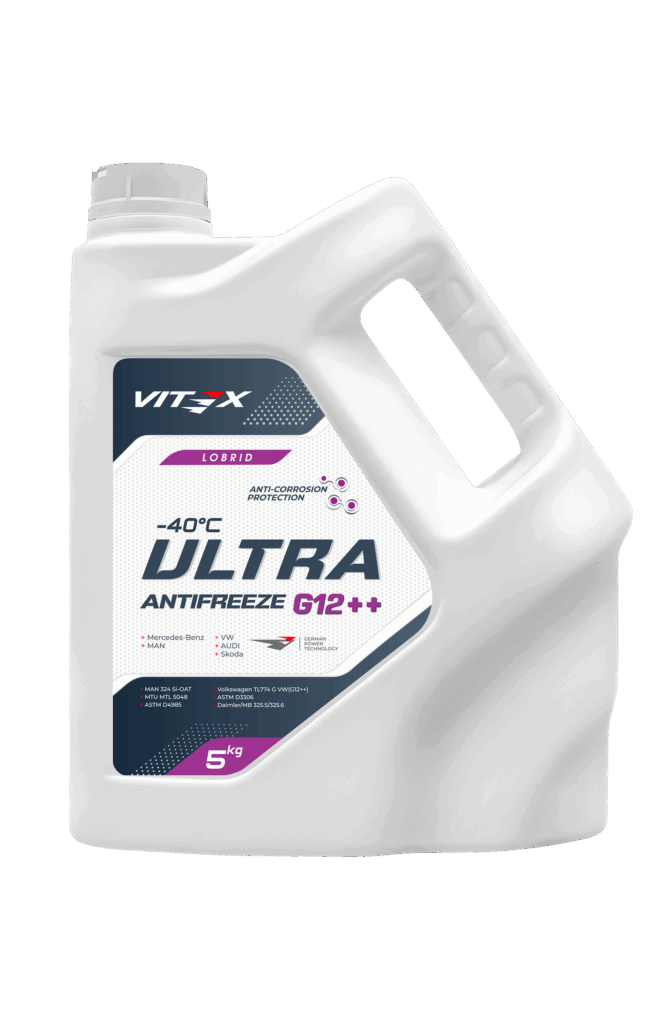Профессиональный антифриз Vitex G12++ Ultra G изготовлен по лобридной технологии с добавлением силикатов и предназначен для охлаждения двигателей внутреннего сгорания легковых, грузовых автомобилей, а также спецтехники.