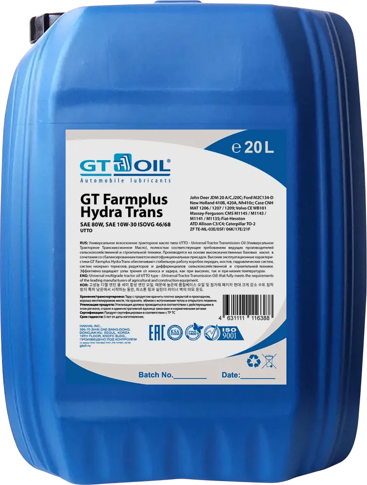 Универсальное всесезонное тракторное масло типа UTTO – Universal Tractor Transmission Oil (Универсальное Тракторное Трансмиссионное Масло), полностью соответствующее требованиям ведущих производителей сельскохозяйственной и строительной техники. Производится на основе высококачественных базовых масел в сочетании со сбалансированным пакетом многофункциональных присадок. Высокие эксплуатационные характеристики GT Farmplus Hydra Trans обеспечивают стабильную работу коробок передач, мостов, гидравлических систем, систем «мокрых» тормозов, редукторов и дифференциалов сельскохозяйственной и промышленной техники. Эффективно защищает узлы трения от износа и задира, как при высоких, так и при низких температурах.