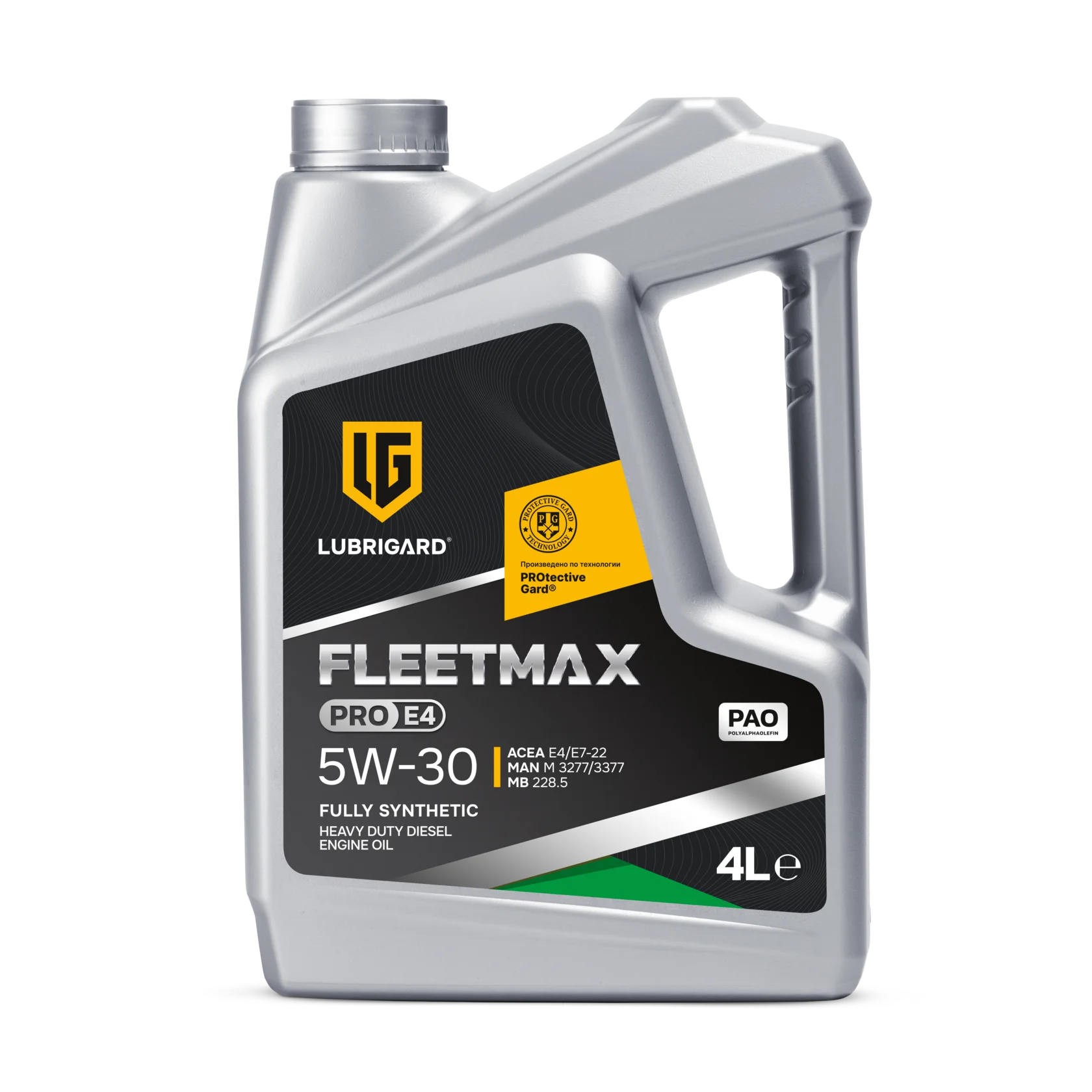 LUBRIGARD FLEETMAX PRO E4 серия масел в специально разработанная для применения в двигателях магистрального коммерческого транспорта, тяжёлых, средних и лёгких грузовиков, самосвалов и спецтехники, а также других видов транспортных средств, оборудованных дизельными двигателями с/без турбонаддува, не оснащённых сажевыми фильтрами (DPF). Предназначено для тяжёлых условий эксплуатации, в том числе при использовании топлива переменного качества.