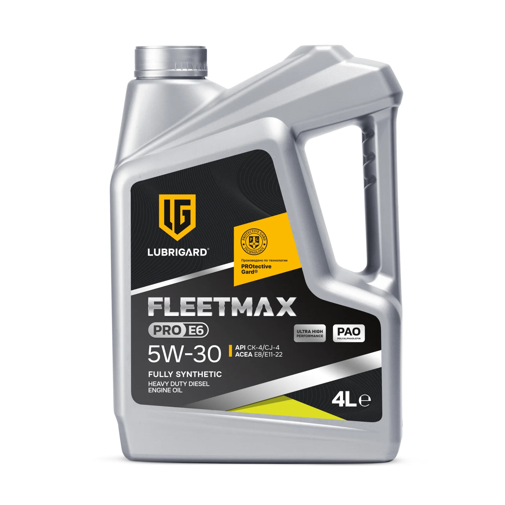 LUBRIGARD FLEETMAX PRO E6 серия масел в специально предназначенная для применения в двигателях, оборудованных системами снижения токсичности отработанных газов (EGR, DOC, DPF, SCR, ASC) магистрального коммерческого транспорта, тяжёлых, средних и лёгких грузовиков, а также двигателях других видов транспортных средств, требующих применения моторных масел со сниженной зольностью и продлённым интервалом замены.