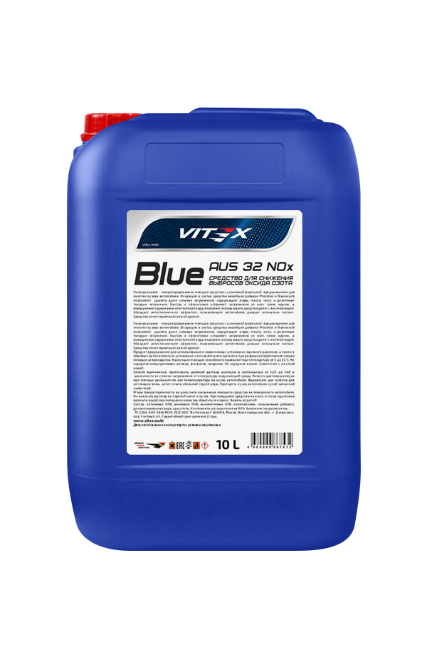 Высококачественный реагент Vitex Blue AUS 32 NOx применяется в качестве добавочной рабочей жидкости в дизельных двигателях, оборудованных системой SCR - селективного каталитического преобразователя, предназначенной для уменьшения выброса в окружающую среду оксидов азота (NOx). Использование реагента нового поколения позволяет провести химическую реакцию аммиака с окисью азота выхлопных газов, в результате которой образуется безвредный азот и водяной пар. Благодаря впрыскиванию реагента достигаются экологические стандарты Евро 4/Евро 5/Евро 6